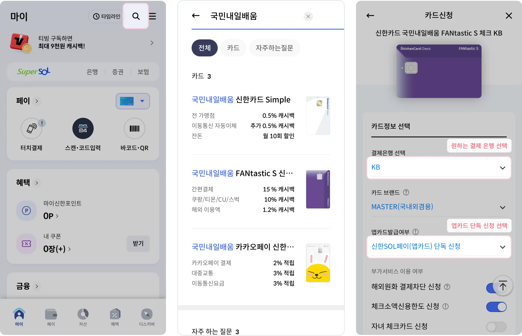 카드사나 카드 종류, 수령 방법 선택을 다르게 하면 안되나요?