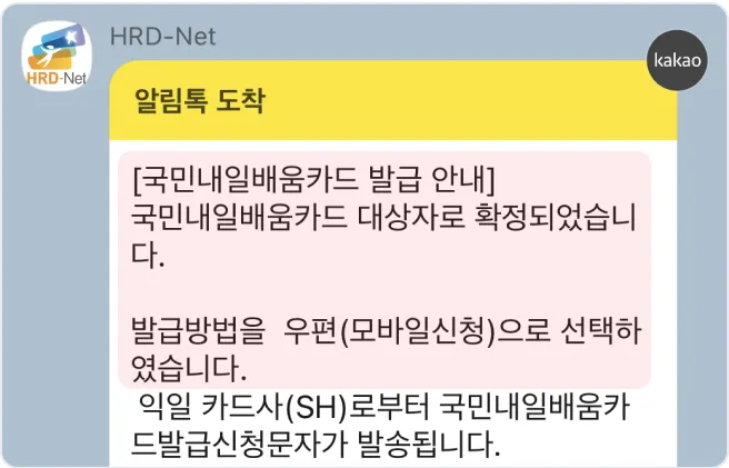내일배움카드 신청 후 대상자 확정 안내 알림톡을 받으셨다면 카드 신청 문자를 기다려 주세요!